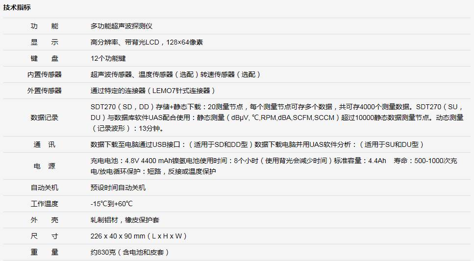 SDT270 是第一个以True Amplitude(全真振幅) 记录的超声波检测仪器,这项技术令超声波首次能够以精确的声音文件保存在数据库中,方便日后对超声波文件进行比较和趋势分析。SDT270 每秒可捕获多达25 万个的超声波信号样本。检测结果是非常明确、精准且可比较的时间信号,这些信号存储在系统庞大的内部存储器中,以方便使用Ultranalysis Suite Software(UAS)软件进行数据管理,音频分析及生成报告。