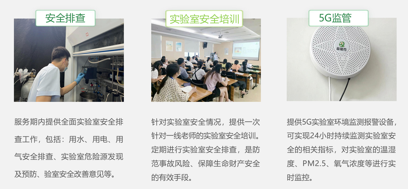 服务期内提供全面实验室安全排 查工作,包括: 用水、 用电、用 气安全排查、 实验室危险源发现及预防、验室安全改善意见等。